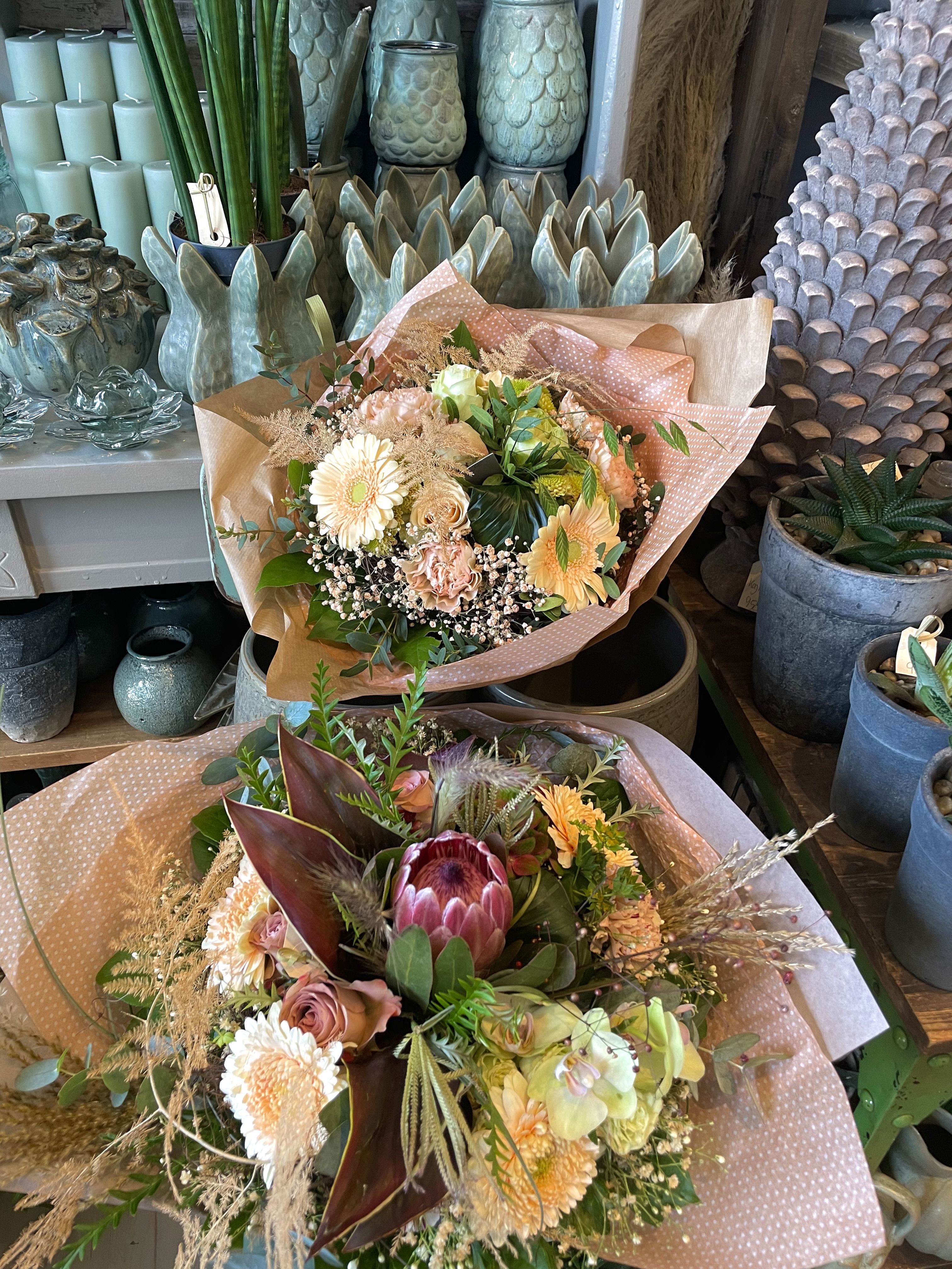 Hos os kan du købe alt fra buketter, dekorationer, vin, Chokolade, og bryllupsbinderier til specialiteter, plantedesign og begravelsesbinderi.
